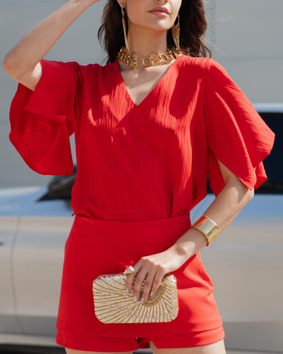 Blusa de escote en V confeccionada en un tejido ligero y texturizado, que aporta elegancia y frescura a cualquier look. Destacan sus mangas amplias tipo capa, que brindan un efecto de movimiento sofisticado y un aire moderno. Su diseño suelto permite libertad de movimiento y versatilidad para combinarla tanto con prendas formales como con opciones más casuales. Ideal para eventos, reuniones o salidas donde quieras lucir elegante y con estilo sin renunciar a la comodidad.