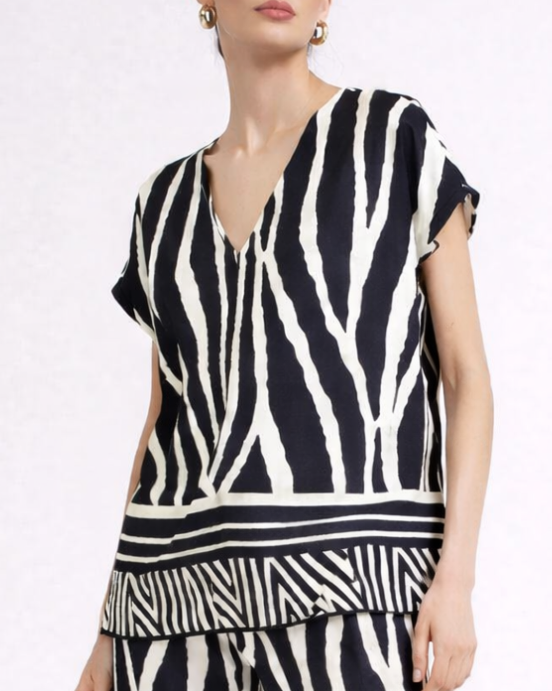 Blusa de silueta relajada con estampado zebra en contraste, ideal para elevar cualquier look con un toque moderno y sofisticado. Presenta escote en V que estiliza el cuello y mangas cortas tipo murciélago que aportan comodidad y caída fluida. El detalle geométrico en el ruedo añade carácter y hace de esta pieza un infaltable para looks urbanos o casual chic.