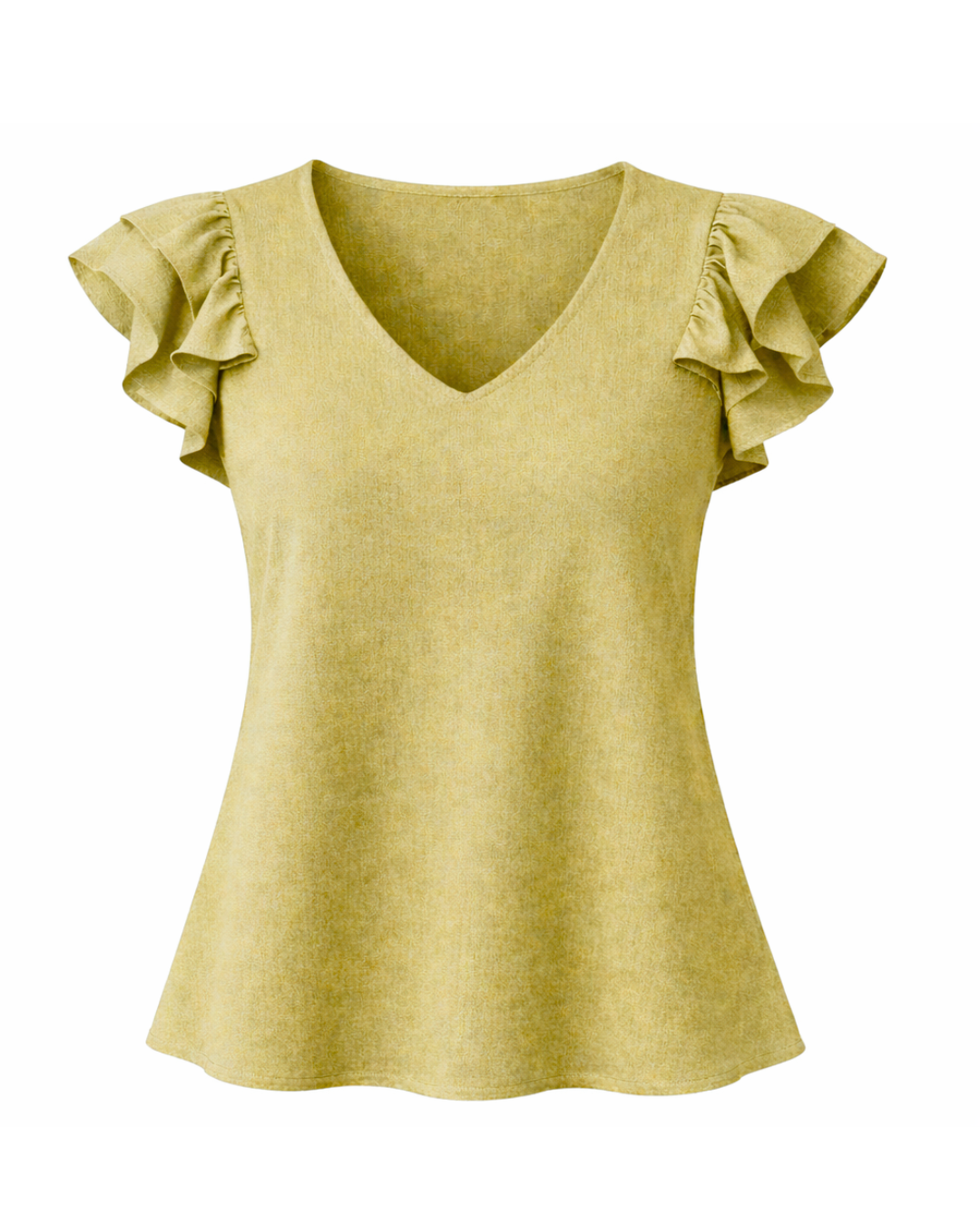 Una blusa femenina y sofisticada que equilibra suavidad y carácter. Su escote en V estiliza delicadamente la figura, mientras las mangas con volante aportan movimiento y un toque romántico moderno.