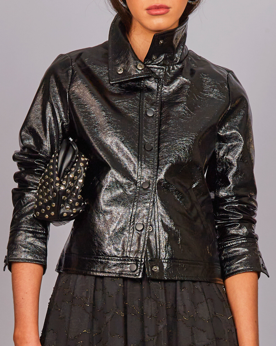 Una prenda con presencia propia. Esta casaca efecto vinilo en color negro es ideal para quienes buscan un look con actitud. Su acabado brillante, corte estructurado y detalles metálicos hacen de esta pieza un statement urbano perfecto para looks de noche o para elevar un outfit básico.