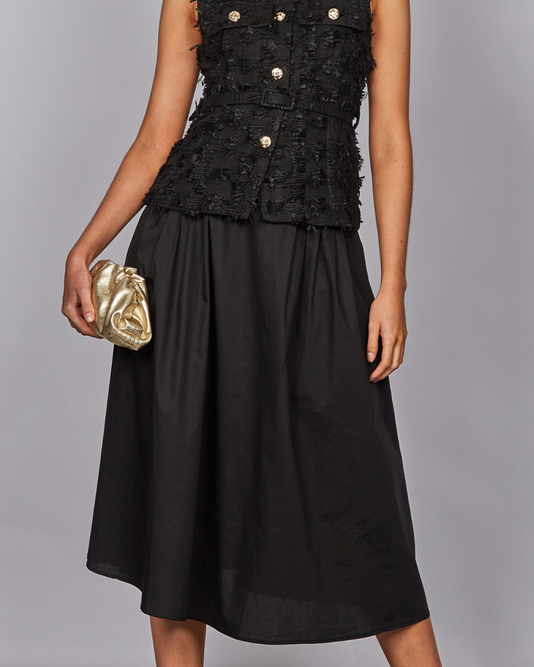 Ideal para ocasiones especiales o para transformar un outfit de día en uno de noche con solo cambiar los accesorios. Combínala con blusas estructuradas o tops minimalistas para un look equilibrado y refinado.