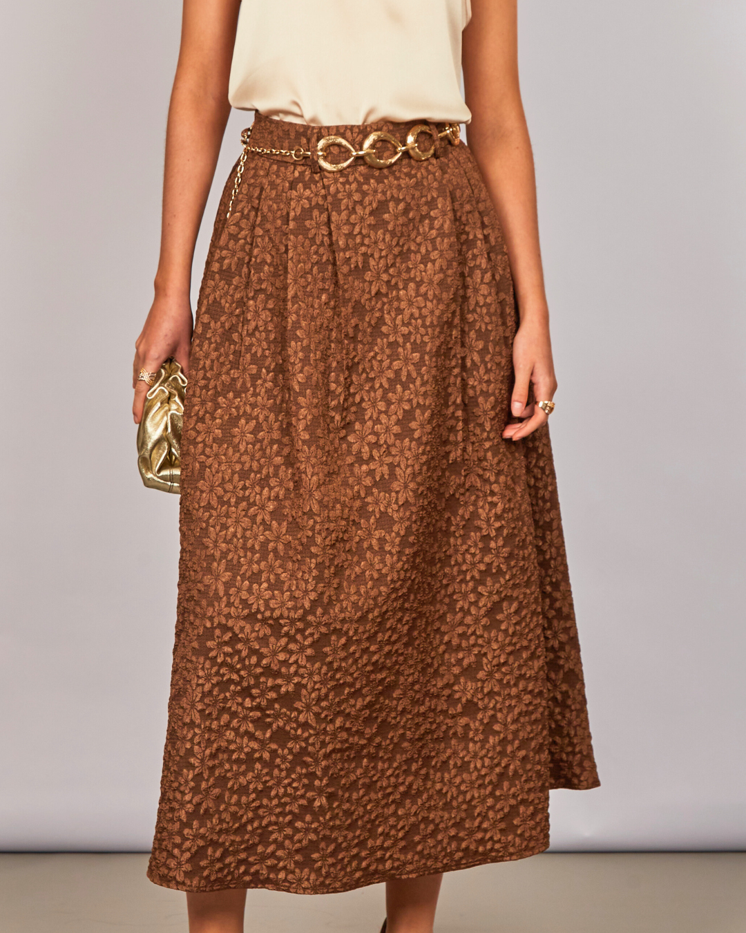 Falda midi jacquard floral en tono chocolate, ideal para elevar tus looks de temporada. Confeccionada en un tejido con textura y diseño de flores en relieve, esta prenda combina elegancia clásica con un toque contemporáneo. Su corte evasé favorece todo tipo de siluetas, mientras que la cintura alta y el calce fluido estilizan tu figura.