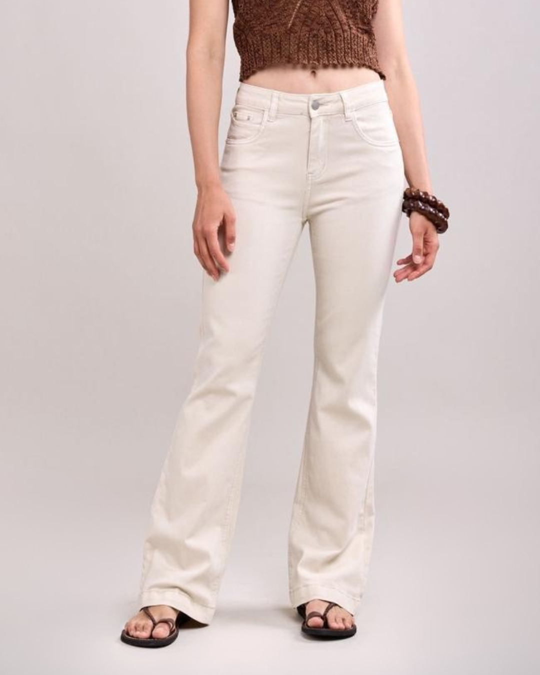 Este pantalón blanco de corte bootcut es la prenda ideal para elevar cualquier look. Confeccionado en un tejido suave y cómodo, su diseño de tiro medio realza la figura y alarga visualmente las piernas. Su color neutro lo convierte en un básico infaltable que combina con todo.