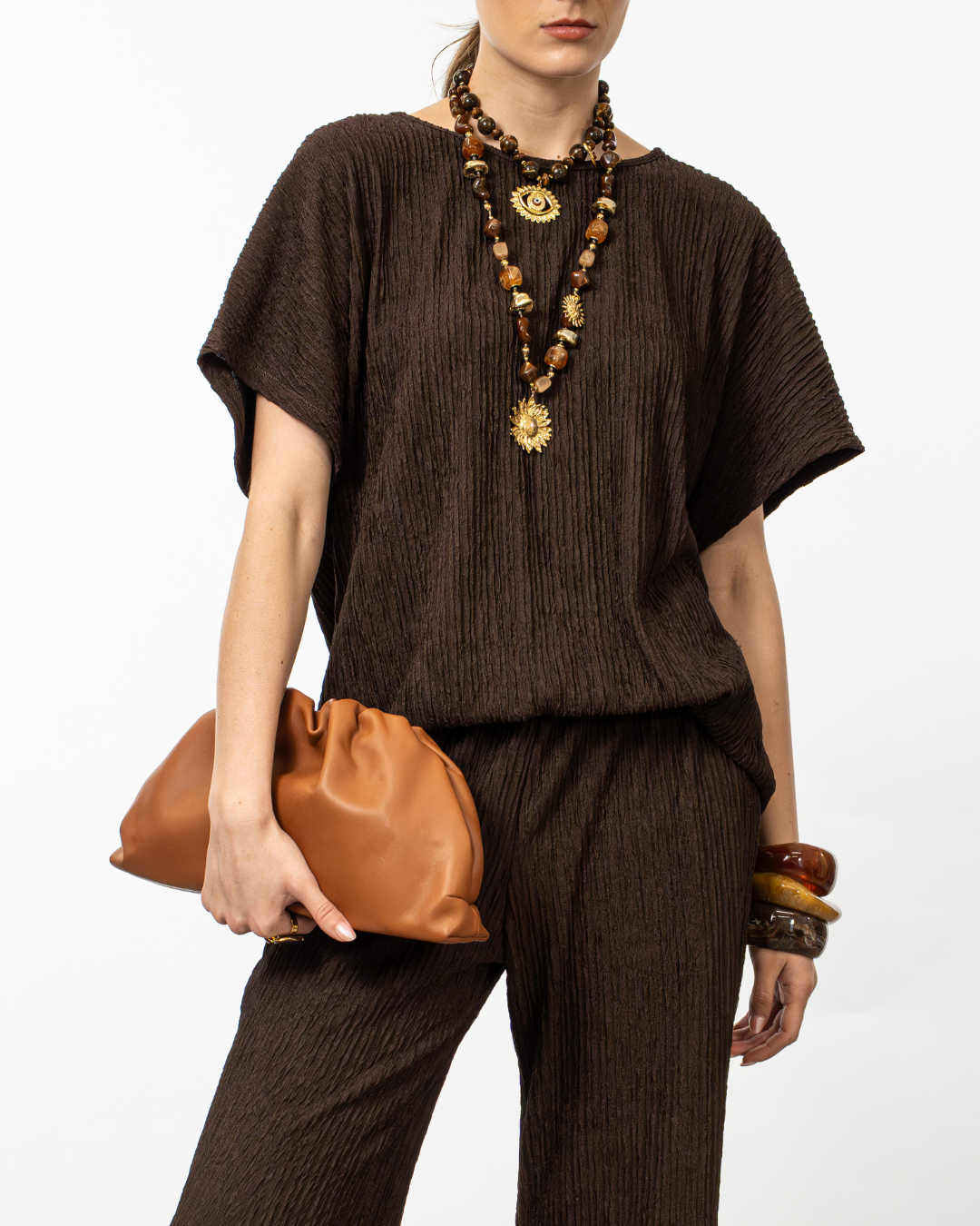 El acabado plisado aporta movimiento y un look moderno, mientras que las mangas cortas tipo murciélago generan una sensación de comodidad total y estilo desenfadado. Ideal para usar en conjuntos monocromáticos o combinar con piezas más estructuradas.