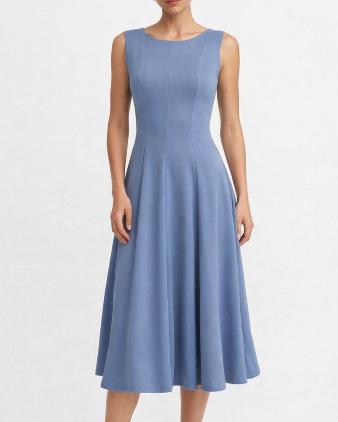 Vestido midi de silueta femenina con corte entallado en la parte superior y falda amplia de caída fluida. Su diseño sin mangas y escote redondo aporta una estética elegante y atemporal, ideal para diversas ocasiones. Las líneas verticales del delantero estilizan la figura, mientras que el tejido con buena estructura garantiza comodidad y un calce favorecedor.
